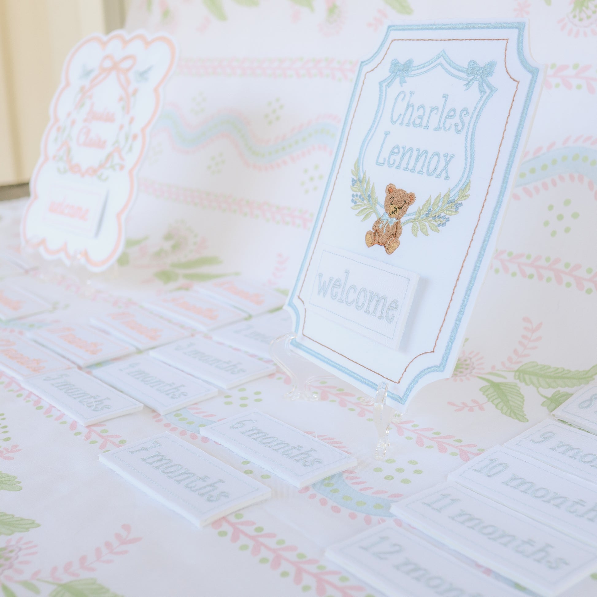 Our Embroidered Milestone Card Set is a handcrafted keepsake designed to thoughtfully capture each month of your baby’s first year. Featuring one timeless embroidered base with interchangeable month cards, this set offers an elegant, space-saving way to document milestones while creating photographs and memories you’ll treasure for a lifetime.
