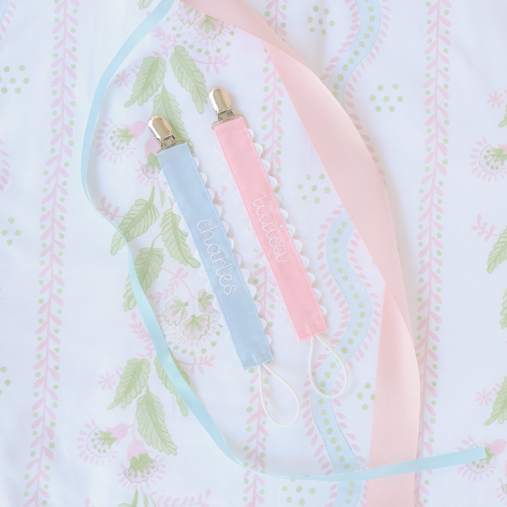 Available in soft pink or blue, each clip may be customized to your chosen font.