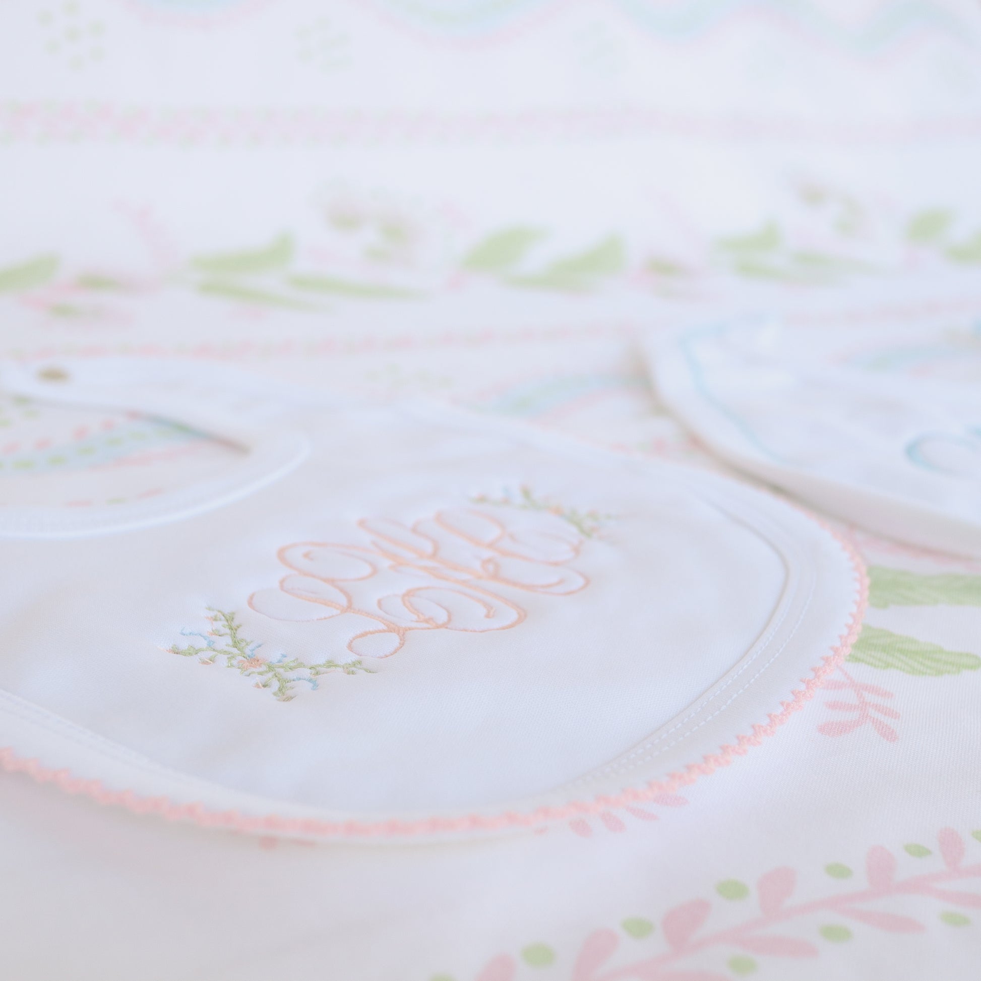 Designed with practicality in mind, our bib features a soft and absorbent fabric that effectively catches spills and dribbles, keeping your baby clean and dry during feeding sessions. The picot trim adds a touch of charm and elegance to the bib, making it a delightful accessory for every meal.
