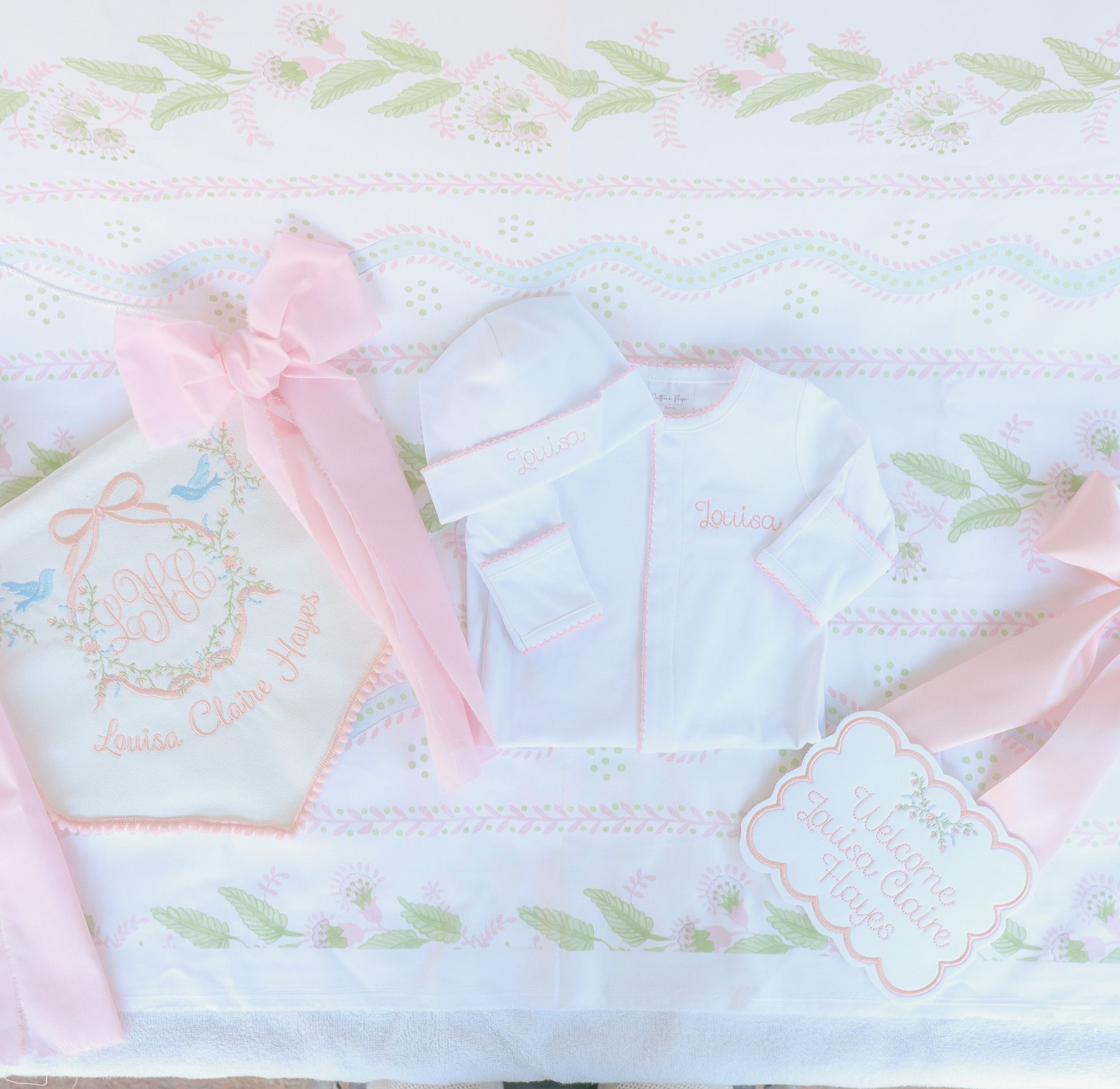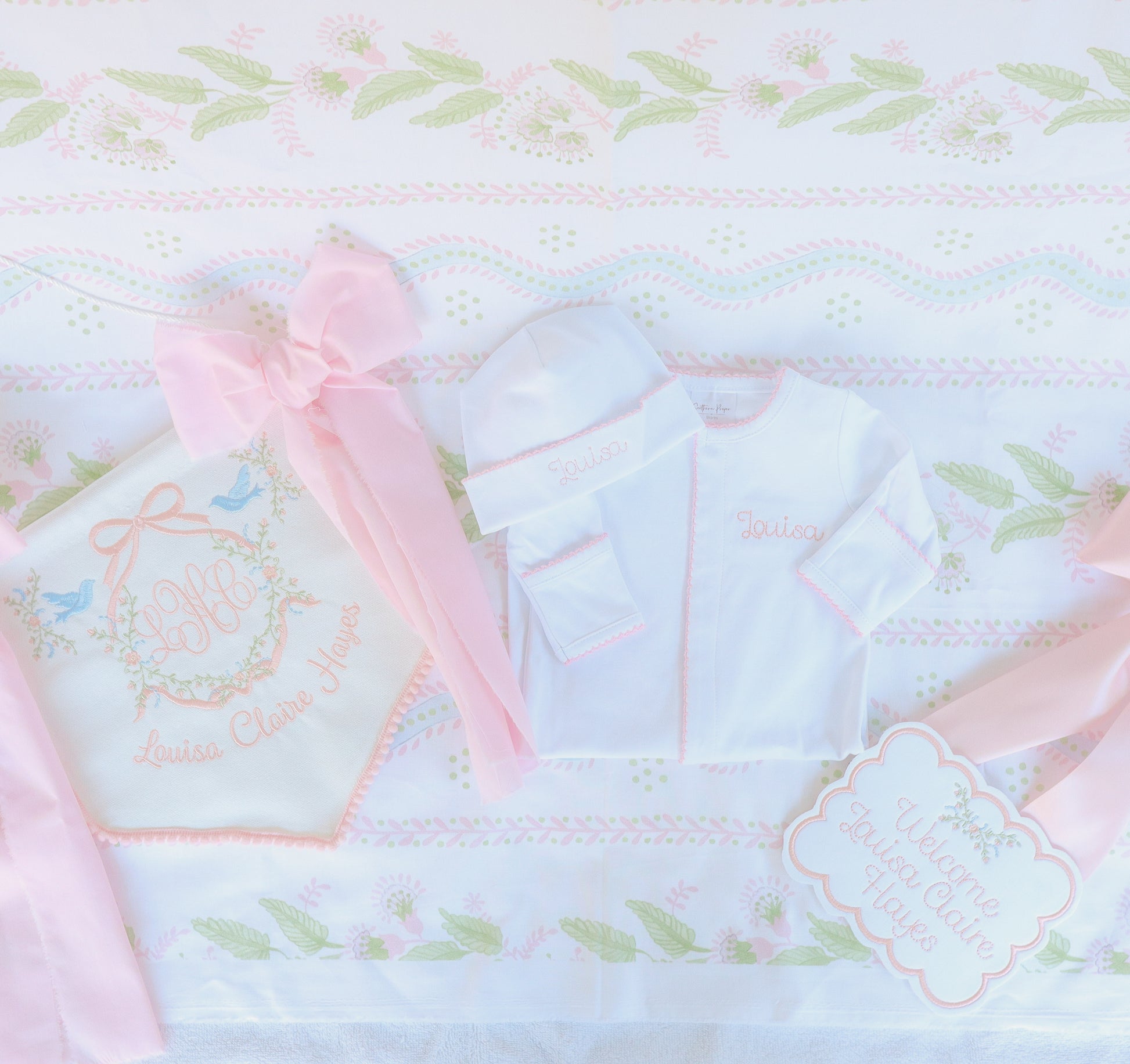 Designed with care and intention, every element—from embroidery style and font selection to color palette and finishing details—is thoughtfully chosen to create a cohesive keepsake set meant to be cherished for years to come.