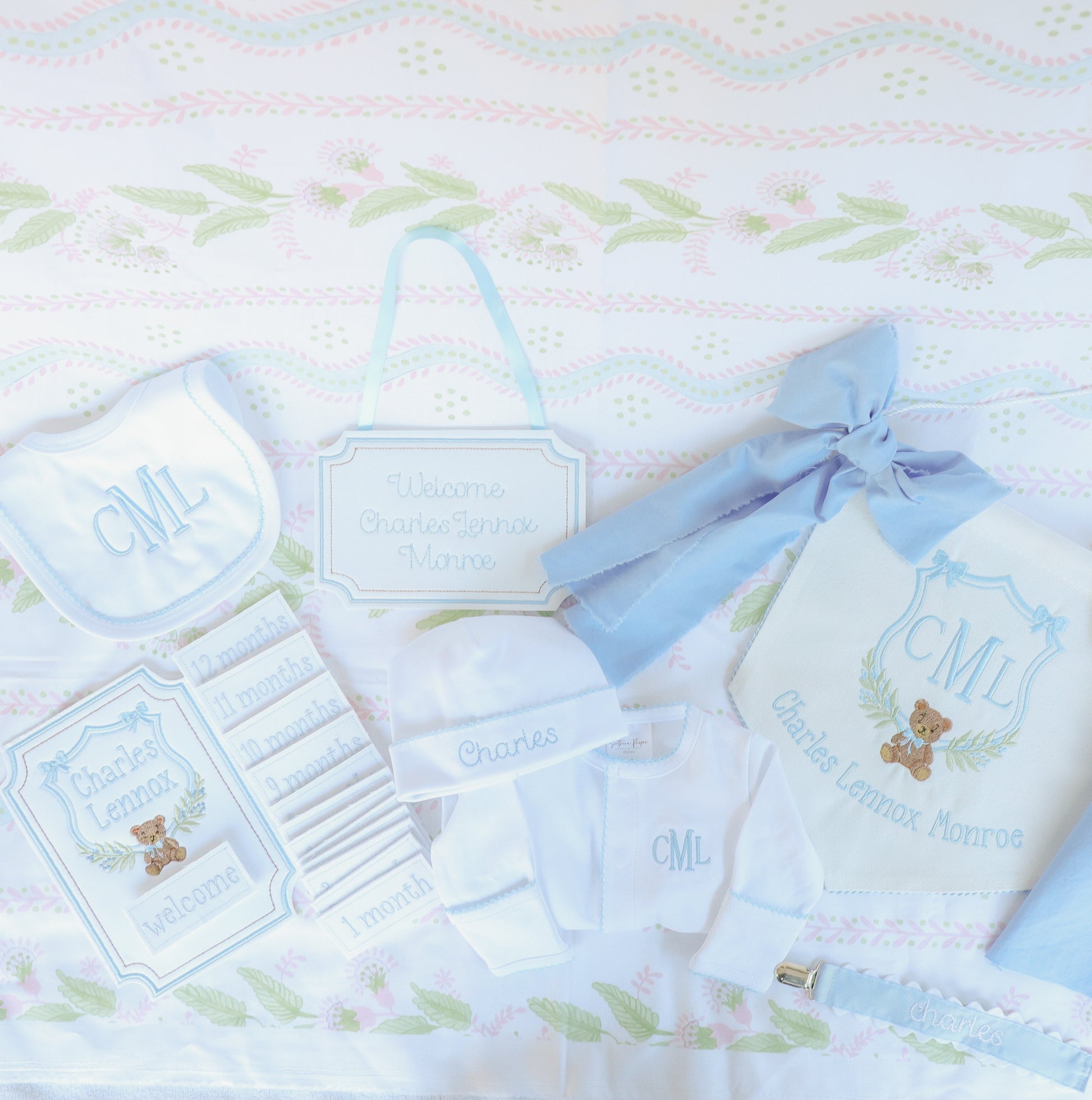 At the heart of the Signature Bundle is a handcrafted embroidered baby banner, designed specifically for your nursery’s colors, style, and inspiration. Once the banner design is established, every additional piece in the bundle is carefully coordinated — from embroidery fonts and motifs to color palette and finishing details — ensuring a harmonious, heirloom-quality set.